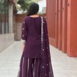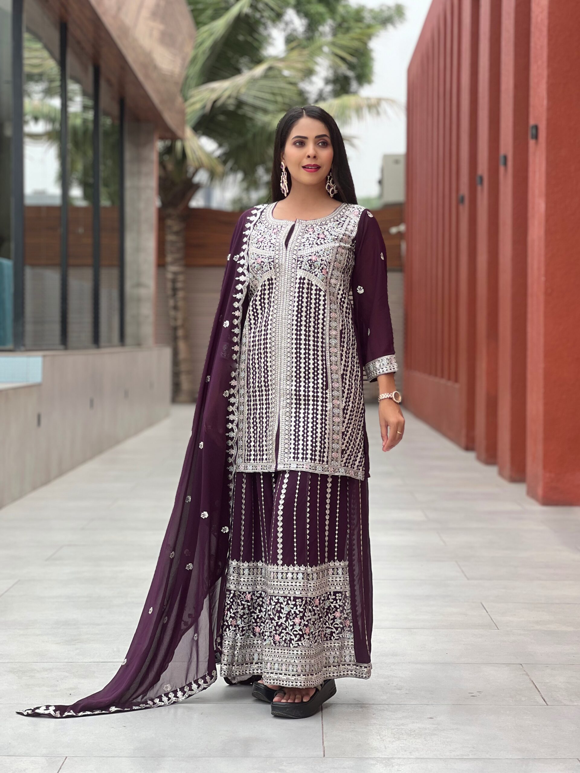Elevate your ethnic wardrobe with this stunning designer purple embroidered kurta with palazzo and dupatta set for women. Crafted from premium fabric, this outfit features intricate thread and sequin embroidery that adds a touch of elegance and charm. The straight-fit kurta is paired with a beautifully flared palazzo and a matching dupatta adorned with delicate embellishments, making it the perfect choice for weddings, festive occasions, parties, and family gatherings. Designed for both comfort and style, this ethnic set ensures you look graceful and fashionable with minimal effort.