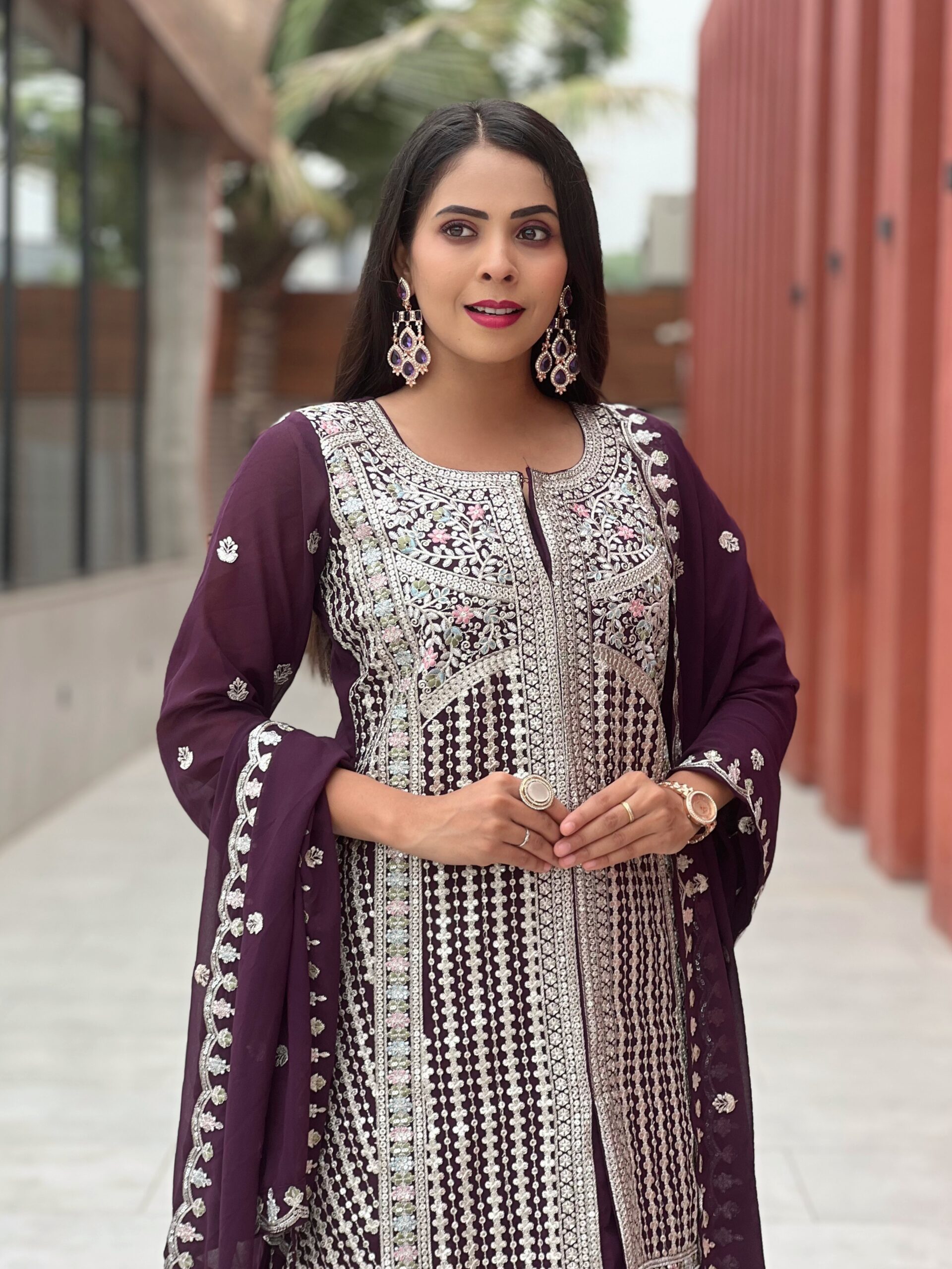 Designer Purple Embroidered Kurta with Palazzo & Dupatta Set for Women | Party Wear Ethnic Suit