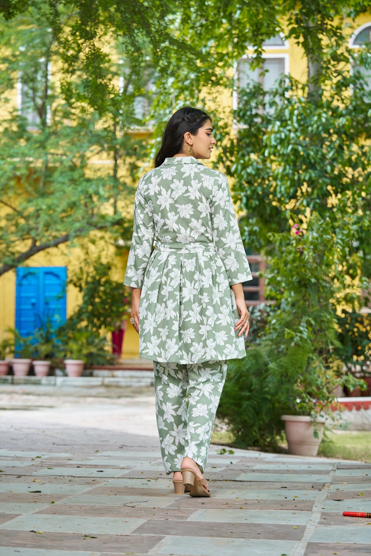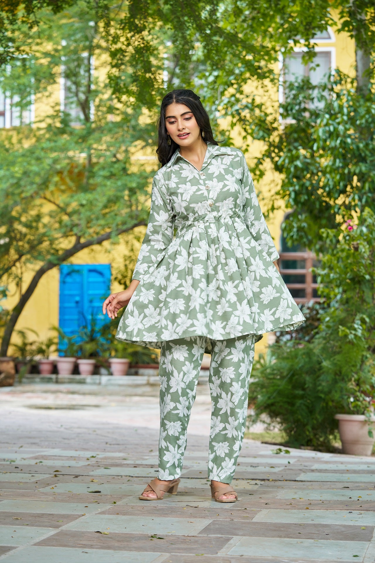 Turn heads with this effortlessly stylish pastel floral co-ord set, designed for modern women who value comfort and elegance. Crafted from soft, breathable fabric, this two-piece set features a button-down longline shirt with a notched collar and matching straight-fit pants. The dreamy floral print in soft pink, lavender, and blue tones adds a touch of feminine grace, making it perfect for casual outings, brunches, or relaxed evenings.