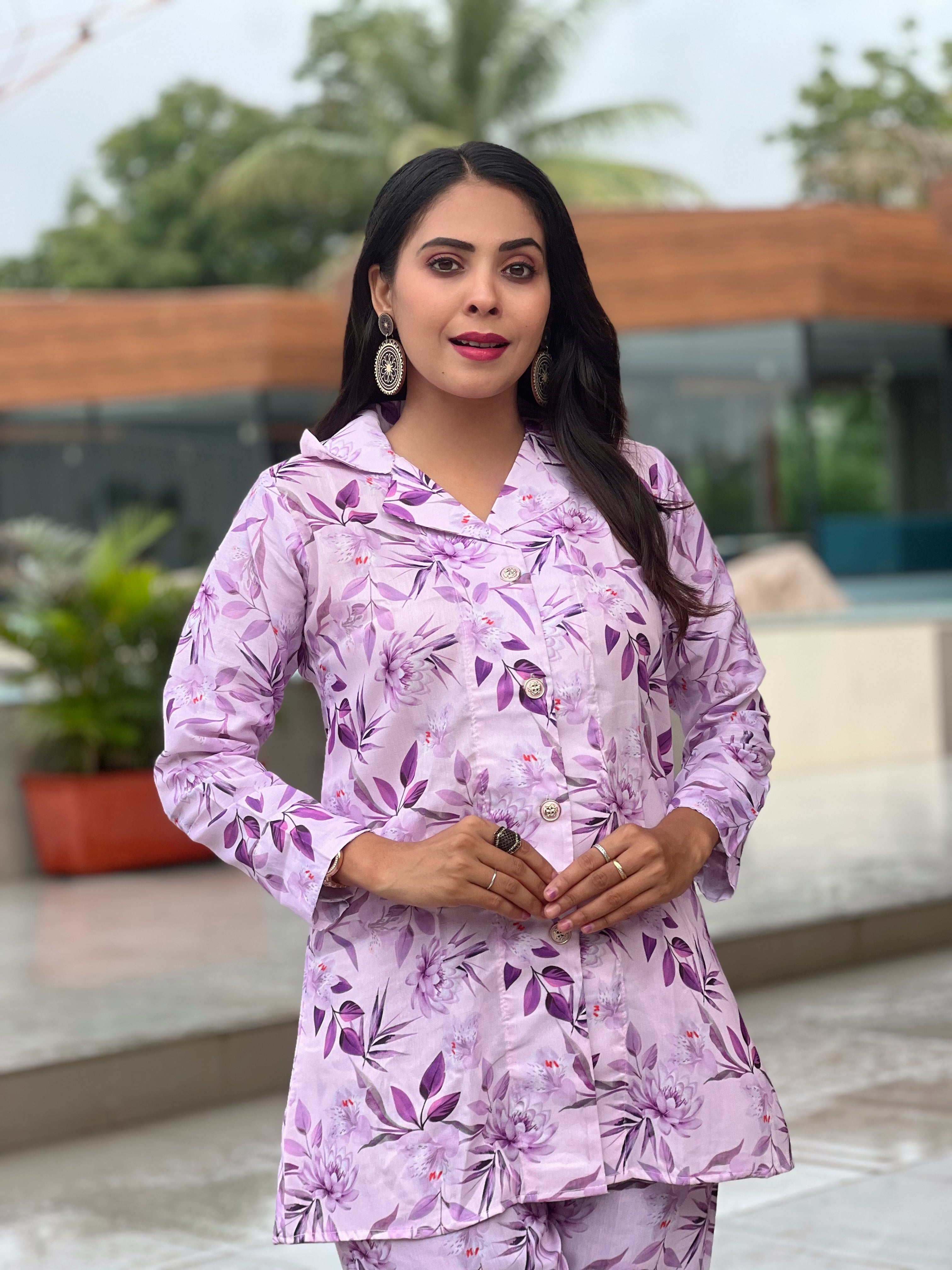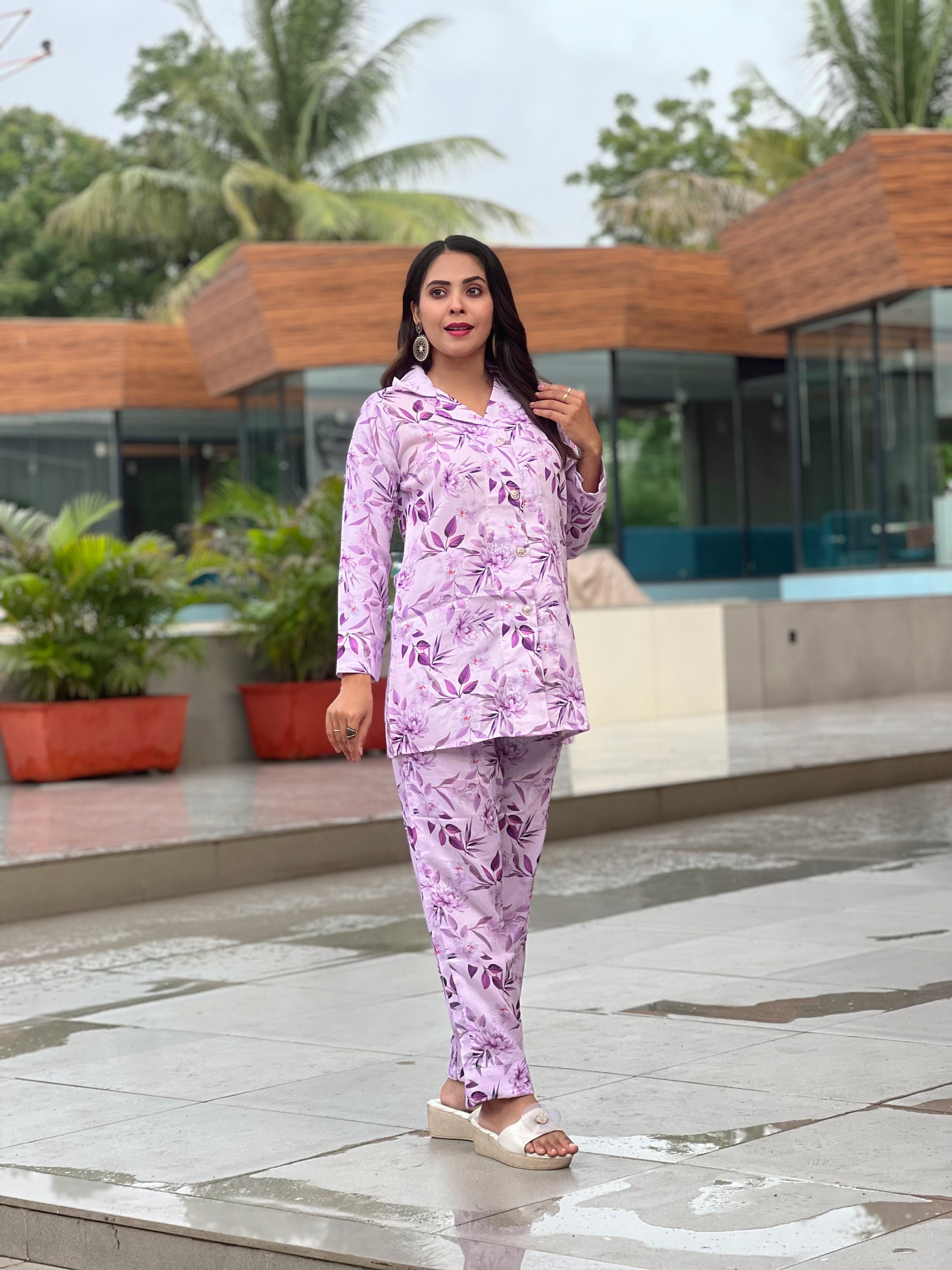 Turn heads with this effortlessly stylish pastel floral co-ord set, designed for modern women who value comfort and elegance. Crafted from soft, breathable fabric, this two-piece set features a button-down longline shirt with a notched collar and matching straight-fit pants. The dreamy floral print in soft pink, lavender, and blue tones adds a touch of feminine grace, making it perfect for casual outings, brunches, or relaxed evenings.