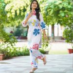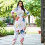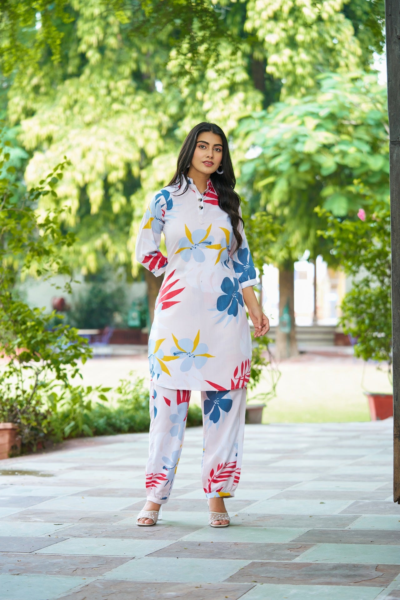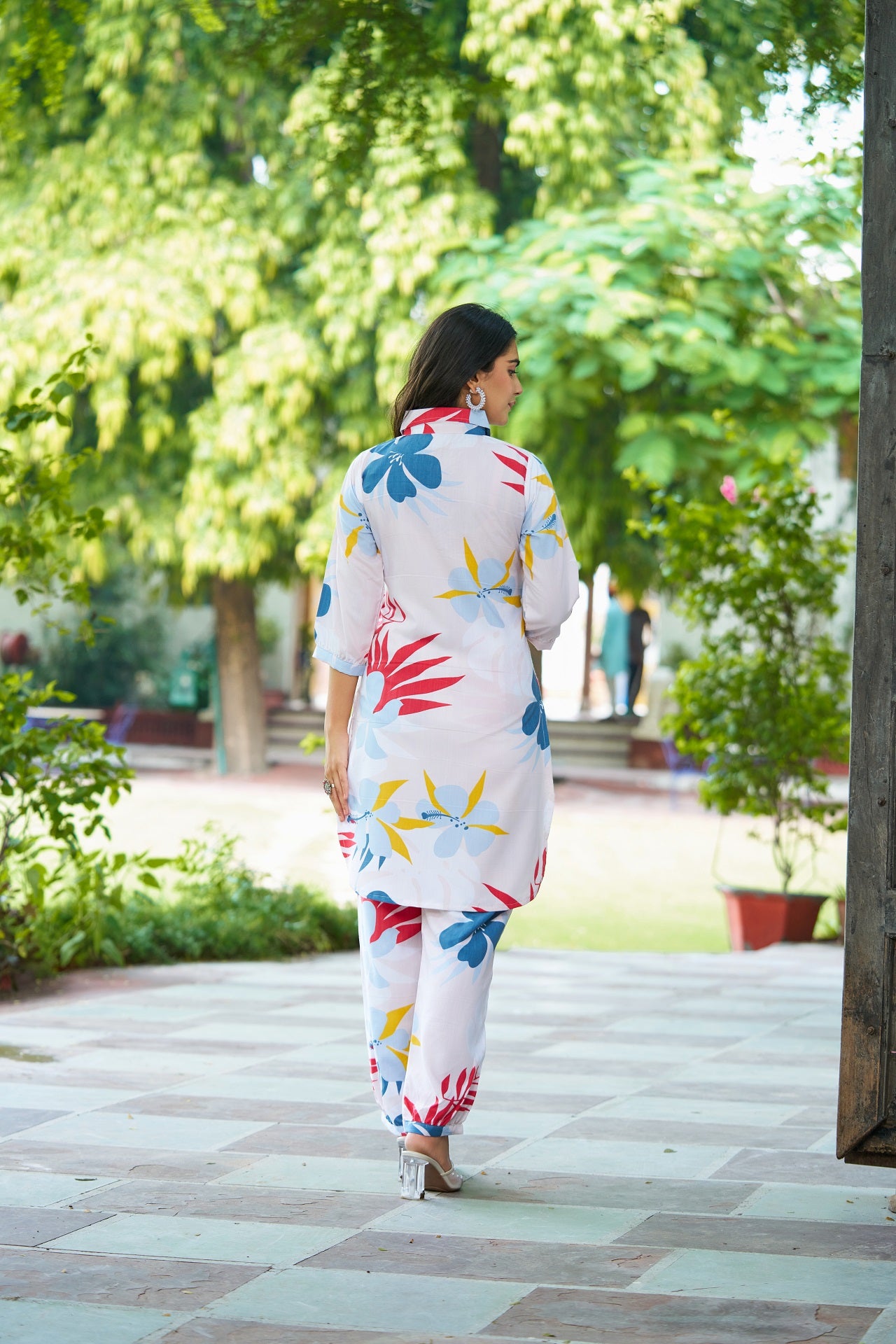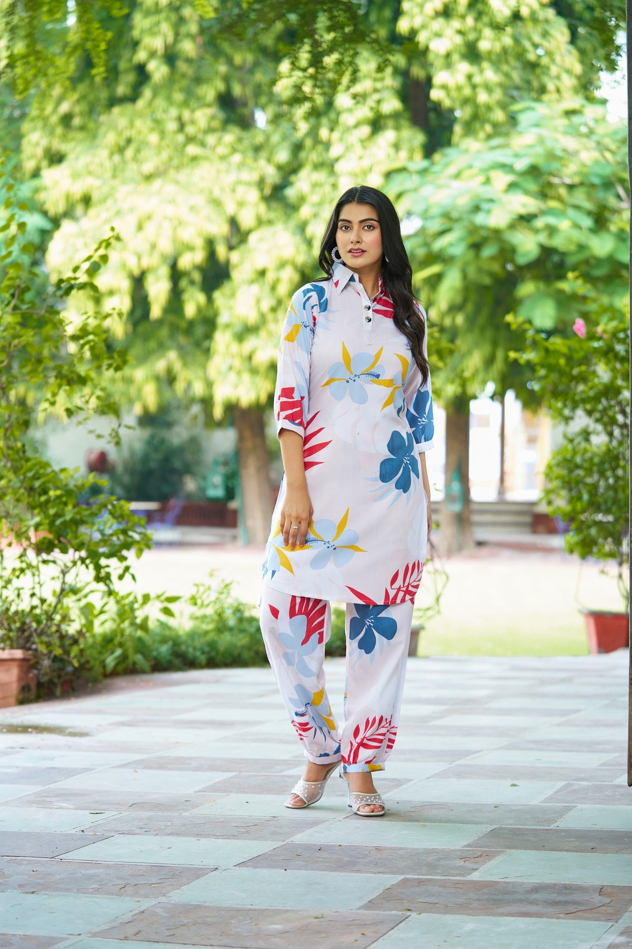 White Floral Printed Co-Ord Set with Collar Neck – Summer Casual Wear